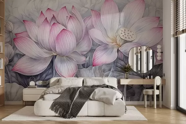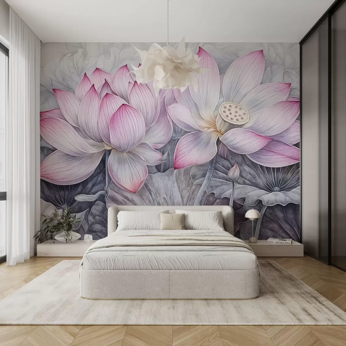Valokuvatapetti Useita yksityiskohtaisia kuvioituja suuria vaaleanpunaisia lootuksen kukkia, joissa on harmaanvihreät lehdet ja varret vaaleaa taustaa vasten Nr w08465