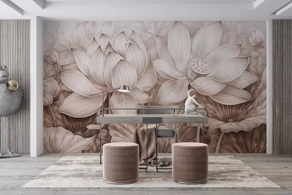 Valokuvatapetti Useita yksityiskohtaisia kuvioituja suuria beigejä lootuskukkia, joissa on ruskeita lehtiä ja varret vaaleaa taustaa vasten Nr w08465v1
