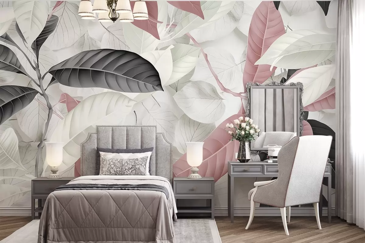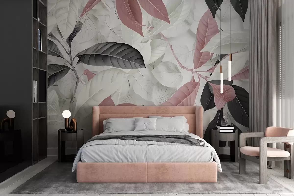 Valokuvatapetti Suuri tulostus vaaleanpunaisia ja harmaita lehtiä vaaleaa lehtien kuvioitua taustaa vasten, mikä luo rehevän trooppisen tunnelman Nr w08468