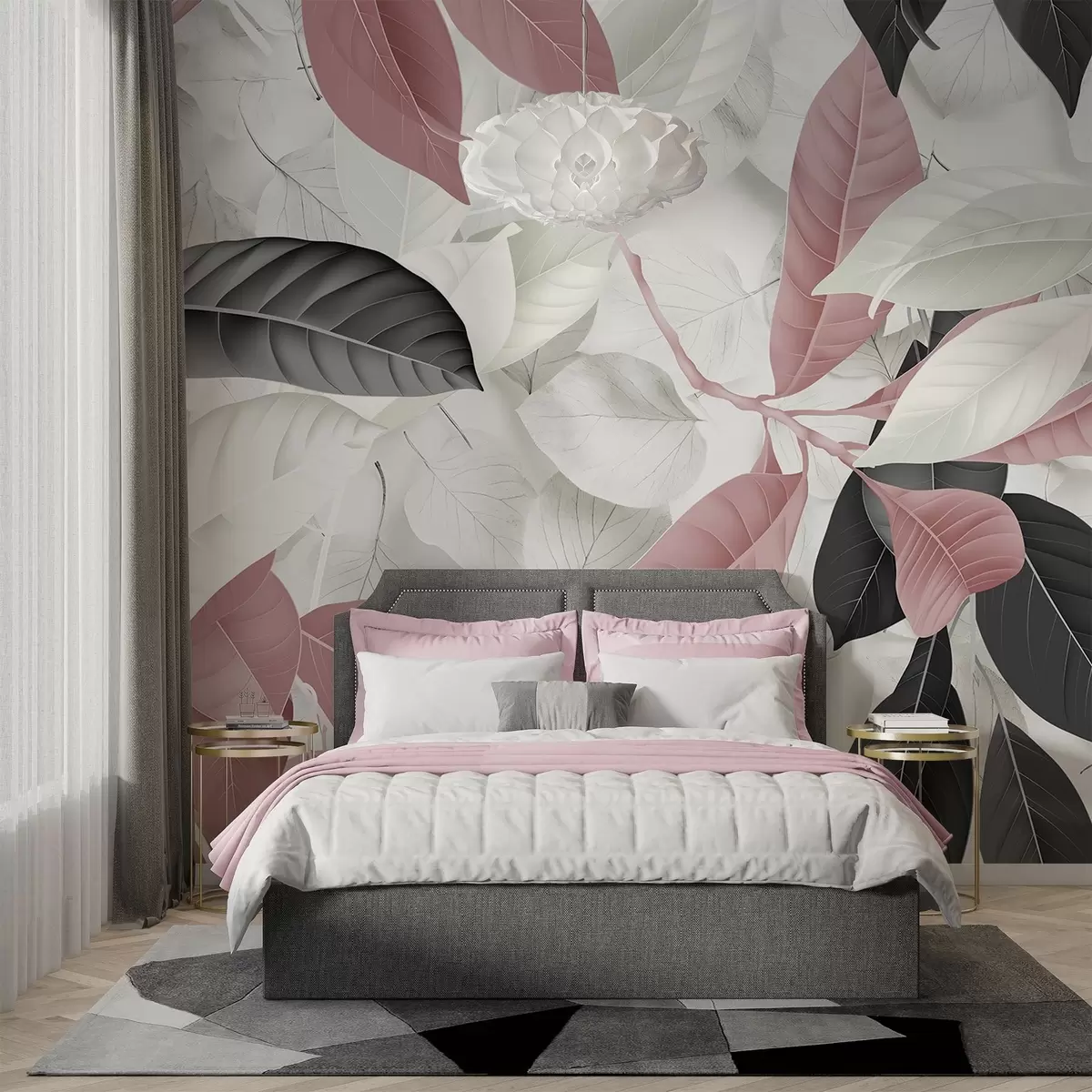 Valokuvatapetti Suuri tulostus vaaleanpunaisia ja harmaita lehtiä vaaleaa lehtien kuvioitua taustaa vasten, mikä luo rehevän trooppisen tunnelman Nr w08468