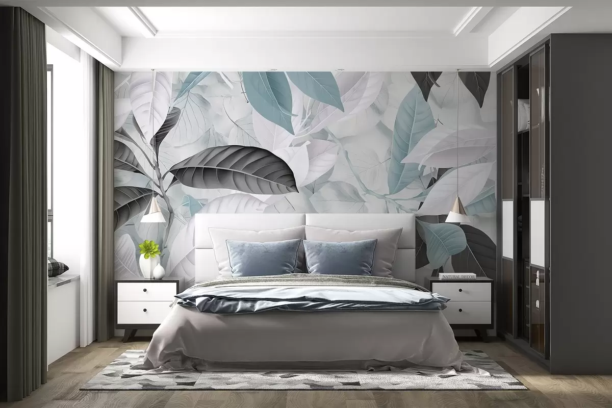 Valokuvatapetti Suuri tulostus sinisiä ja harmaita lehtiä vaaleaa lehtien kuvioitua taustaa vasten, mikä luo rehevän trooppisen tunnelman Nr w08468v1