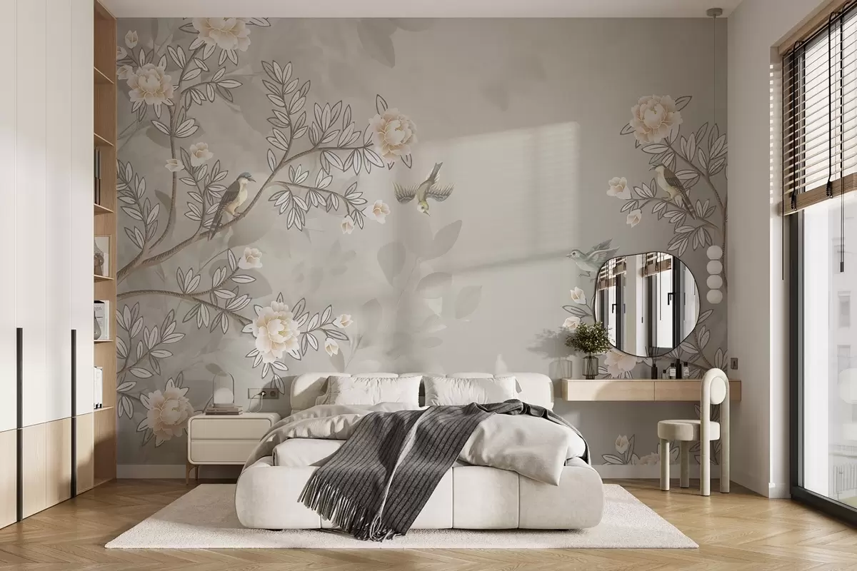 Valokuvatapetti Oksat ruusuilla ja lentävät linnut vaaleissa sävyissä Nr w08493