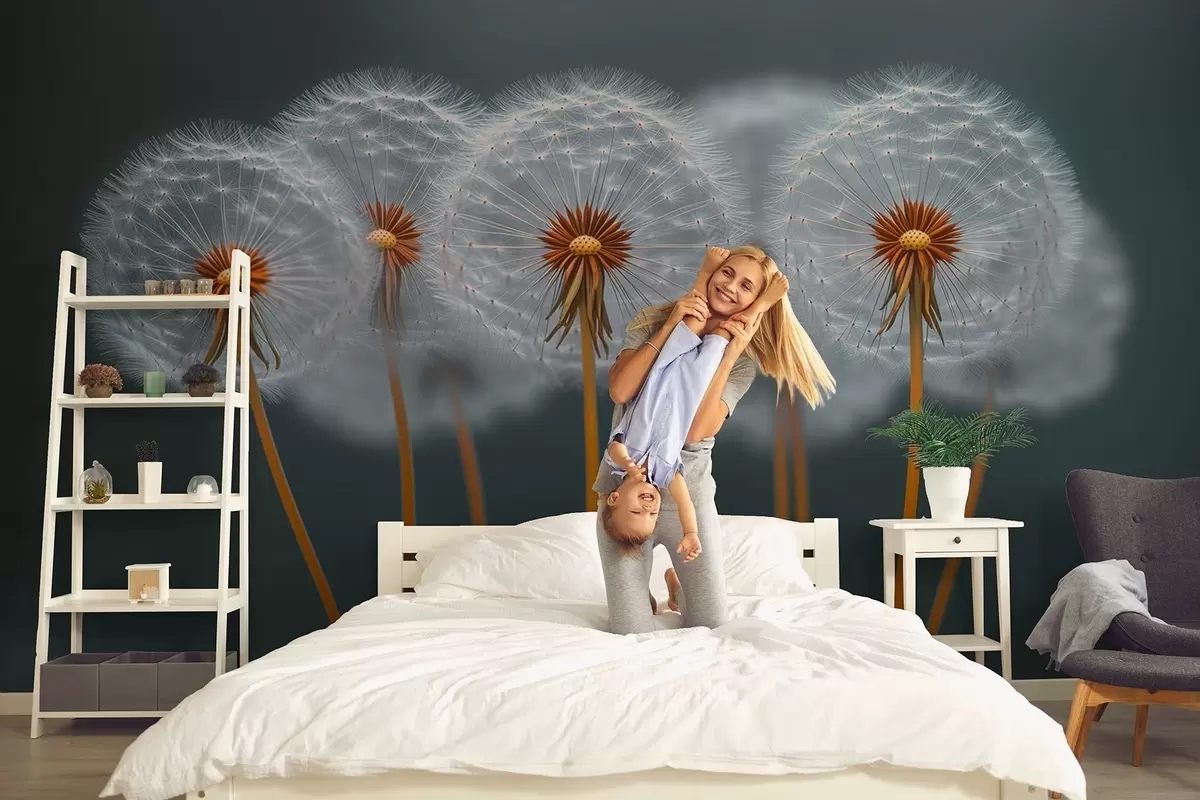 Valokuvatapetti Ilmavia voikukkia tummaa luonnollista taustaa vasten Nr w08498