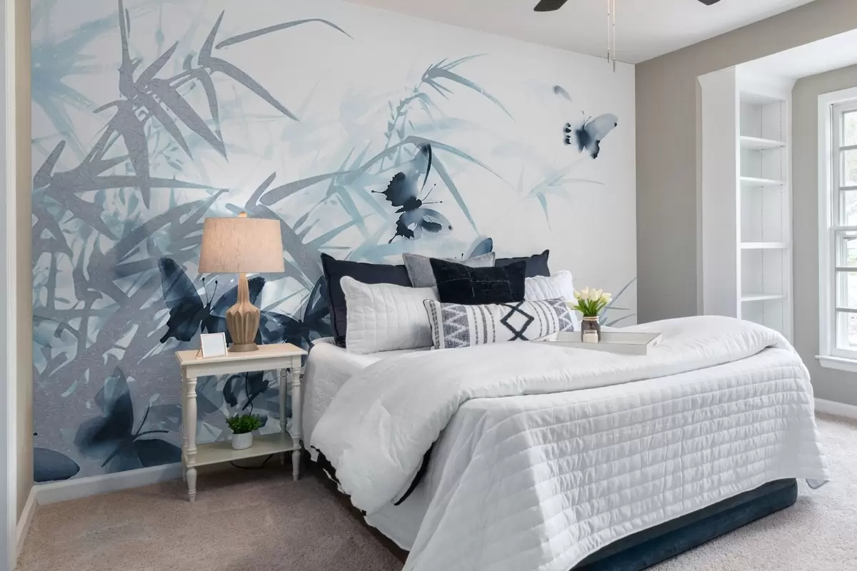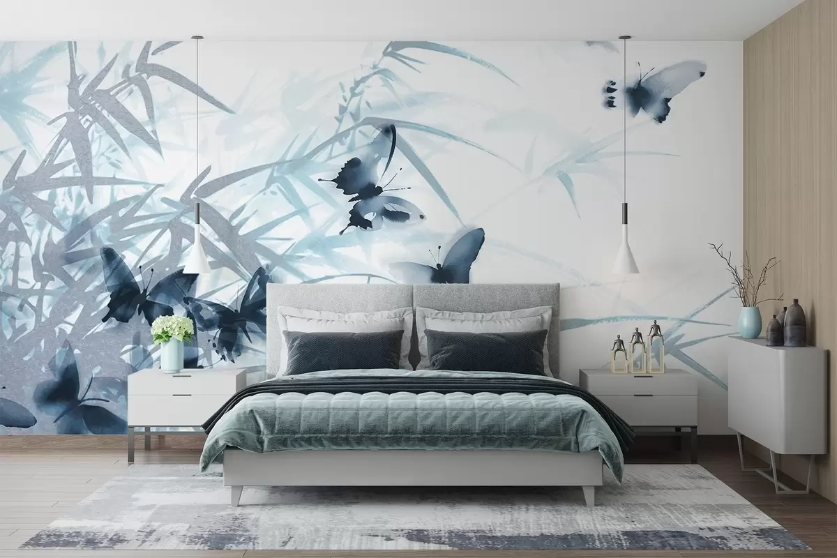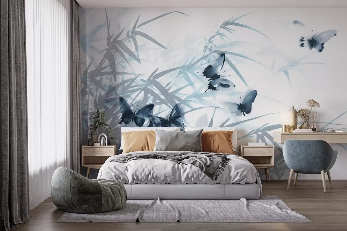 Valokuvatapetti Teksturaalinen bambun lehtiä ja varret lentävät sininen perhosia läpinäkyvä siivet Nr w08524