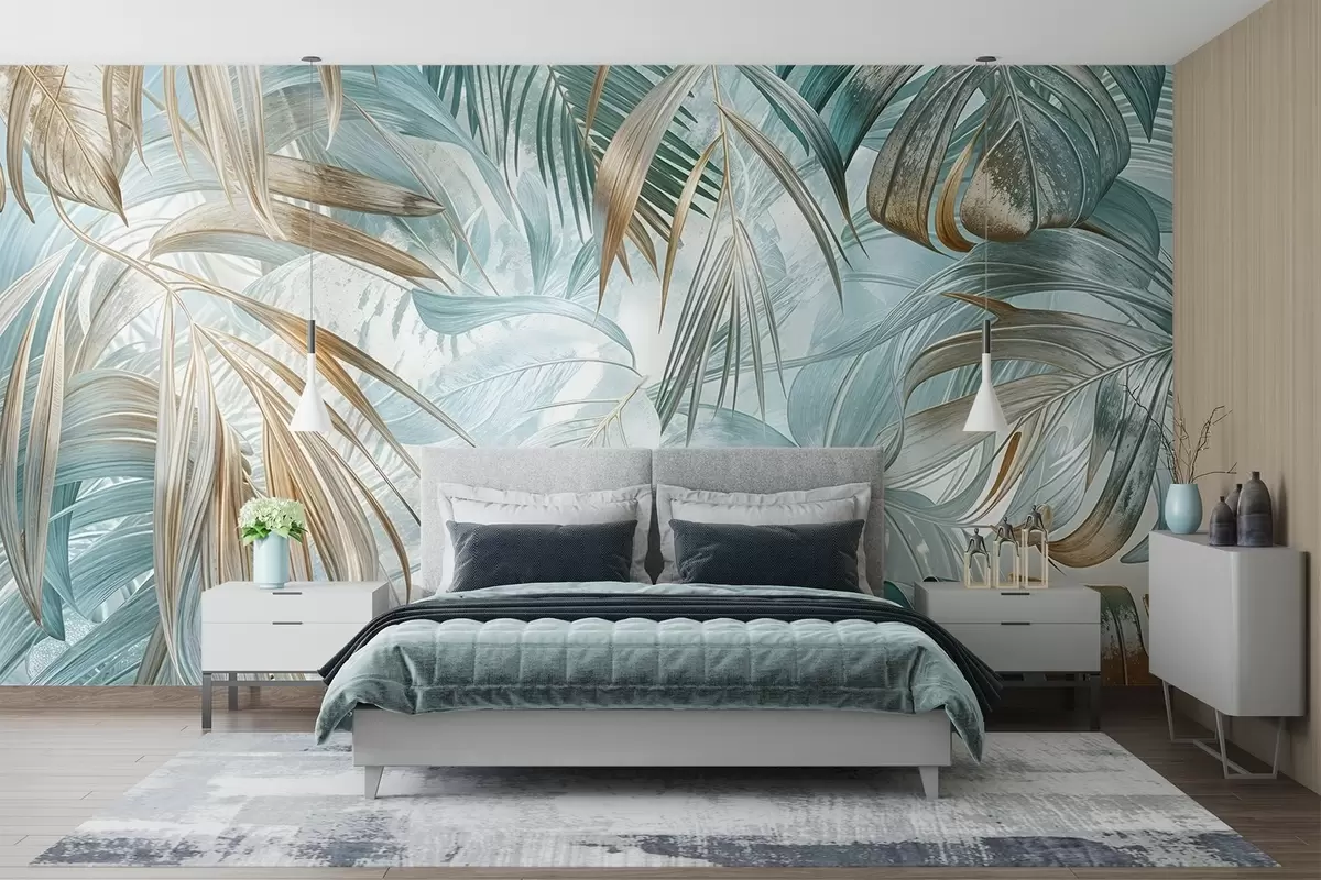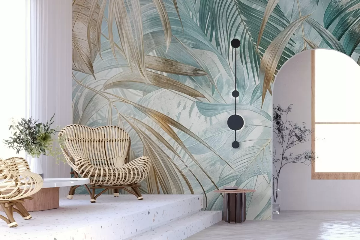 Valokuvatapetti Trooppinen abstrakti kukkakuvio, jossa on suuria palmunlehtiä sinisen ja beigen sävyissä, luo rehevän tunnelman Nr w08532