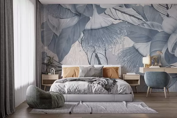 Valokuvatapetti Kasvitieteellinen kuvitus suurista, sinisistä eucaliptus-kukista, joissa on pitkät heteet harmaata ja valkoista taustaa vasten Nr w08539v1