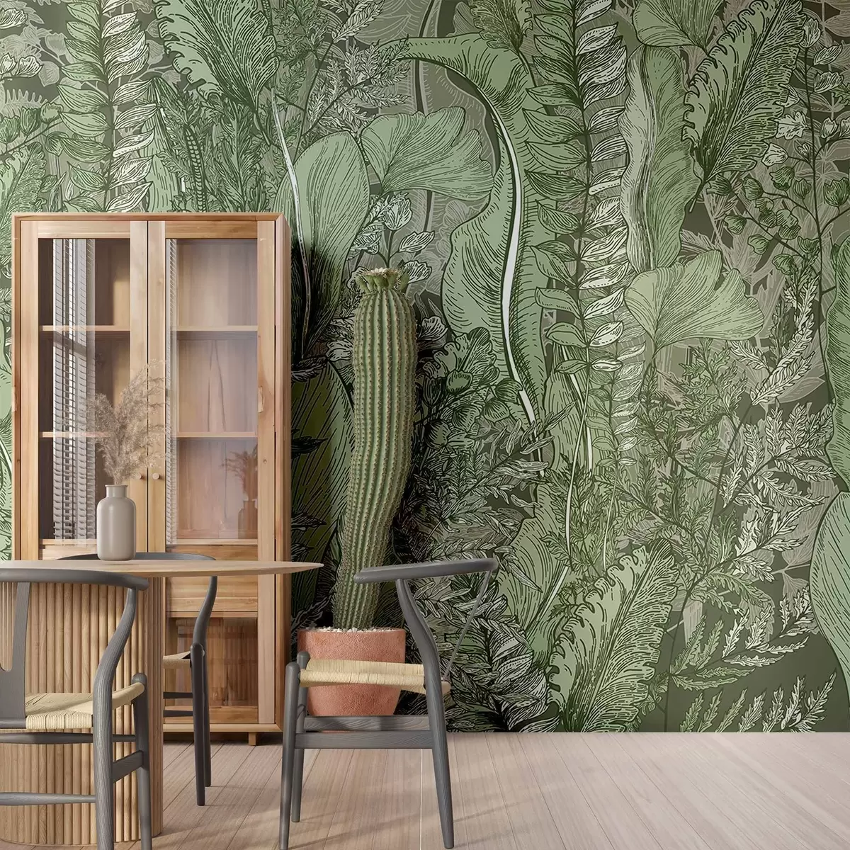 Valokuvatapetti Rehevä, vehreä metsä, jossa on erilaisia saniaisia, lehtiä ja lehtiä vihreän eri sävyissä Nr w08579
