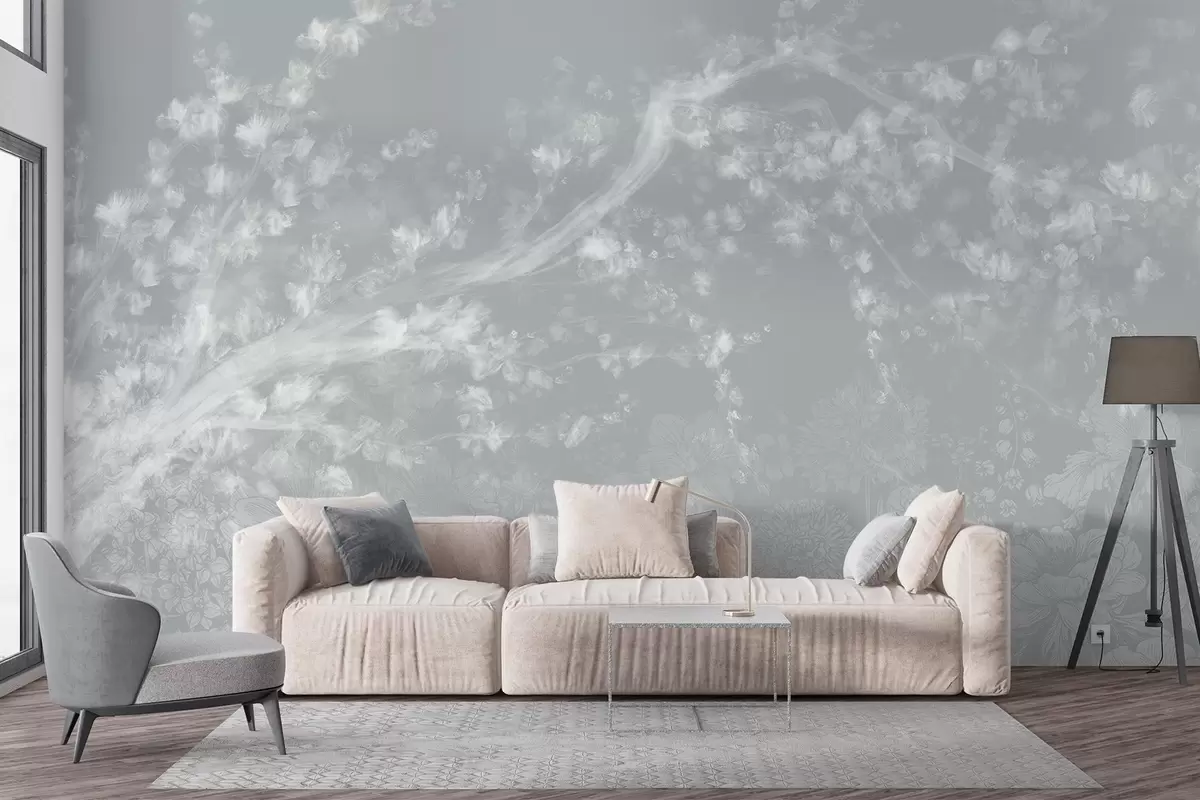 Valokuvatapetti Sumea, epätarkka tuloste, jossa on valkoiset sumuiset puun oksat, joissa on pehmeä vaalea kukka tausta Nr w08581