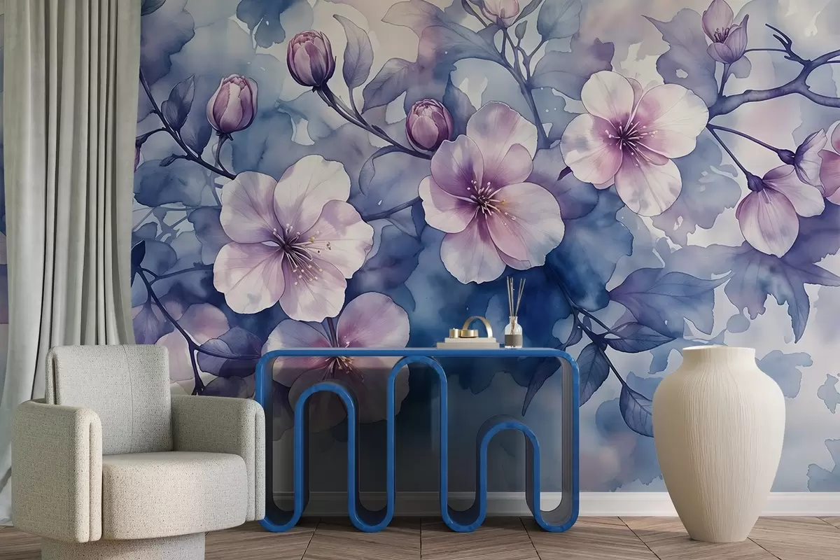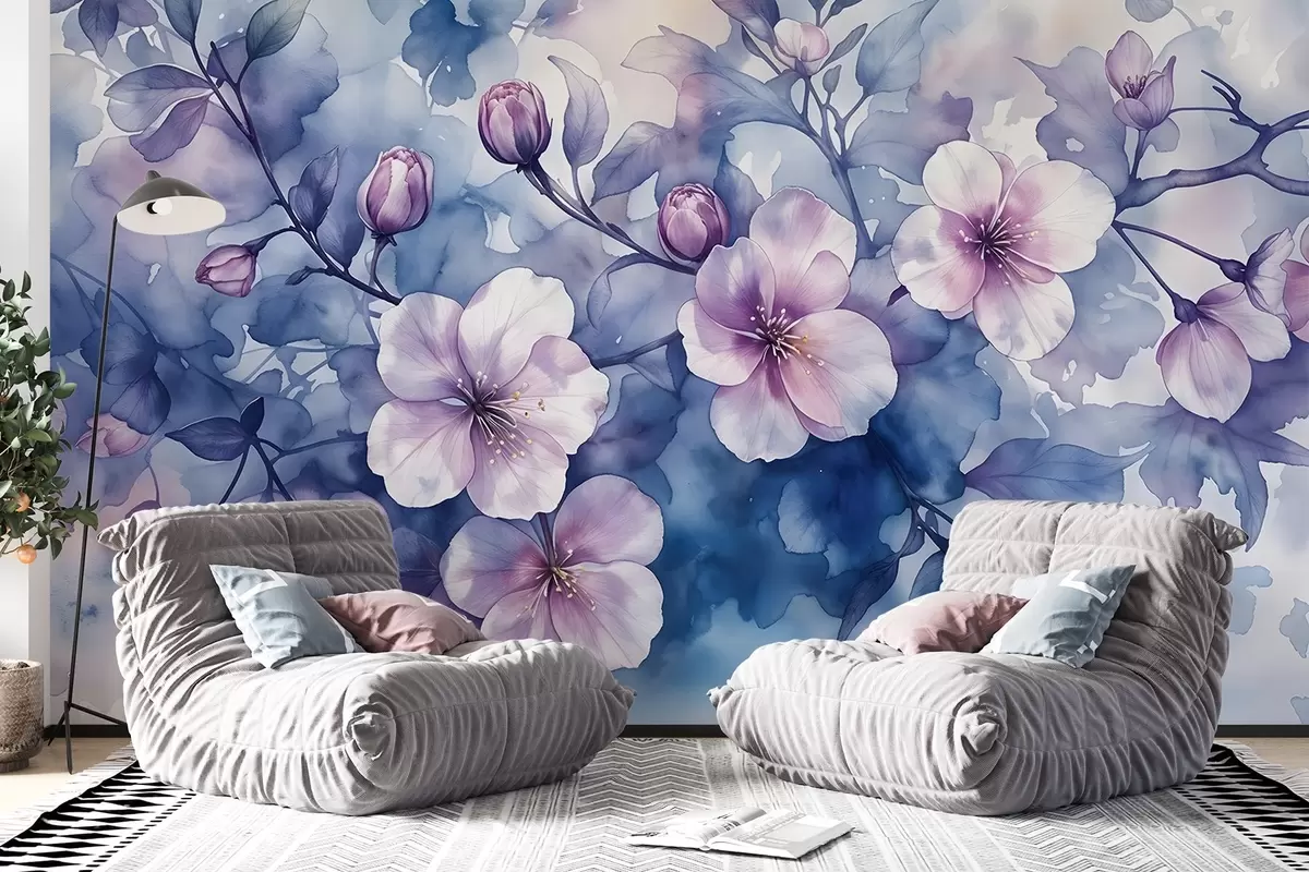 Valokuvatapetti Herkkä akvarellijäljitelmä vaaleanpunaisia ja violetteja kukkia, joiden terälehdet ovat pehmeät ja sumeat sinistä taustaa vasten Nr w08582