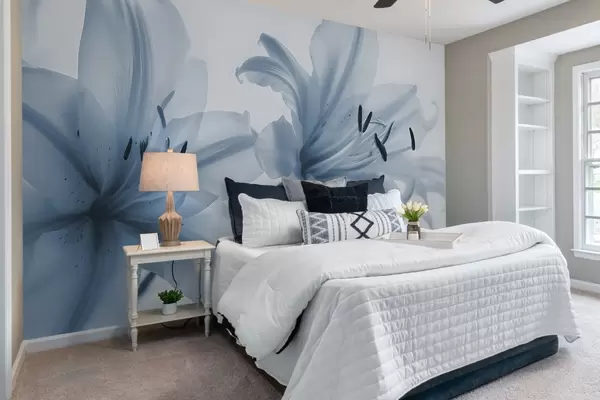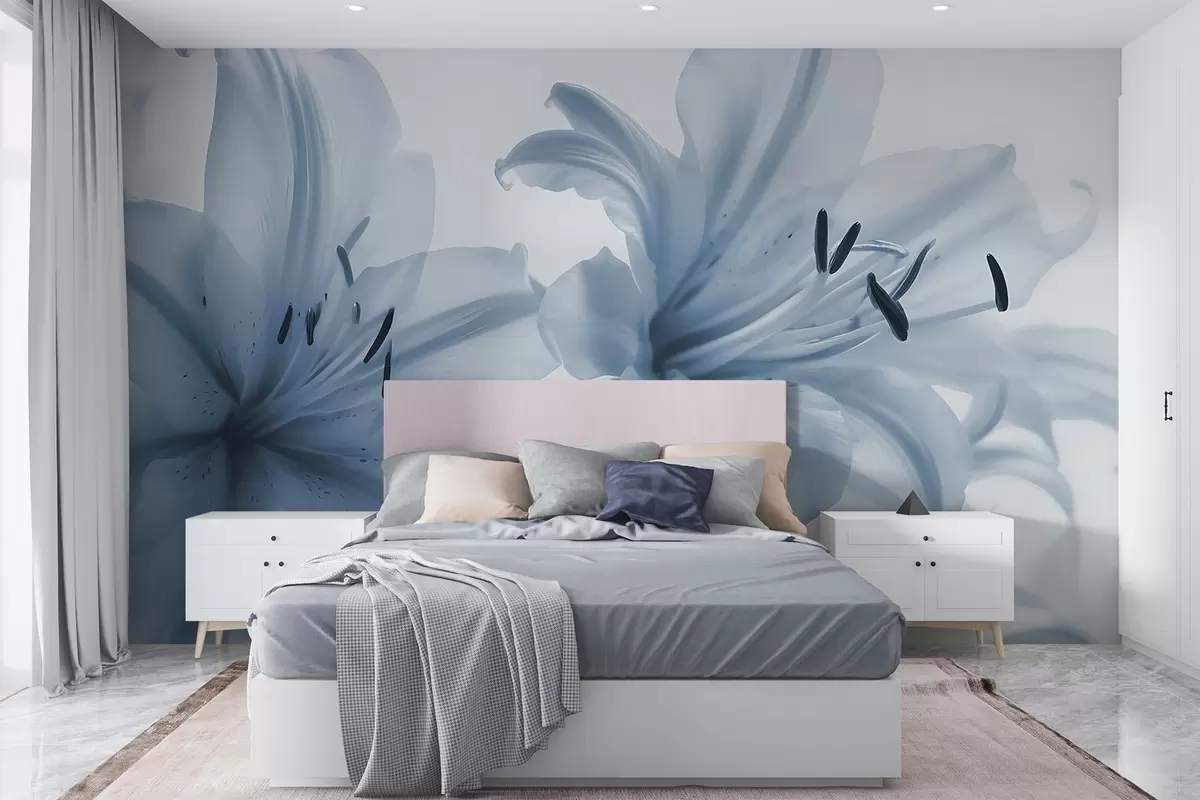 Valokuvatapetti Pehmeä tarkennus lähikuva sinisistä minimalistisista liljakukista vaaleaa taustaa vasten Nr w08586