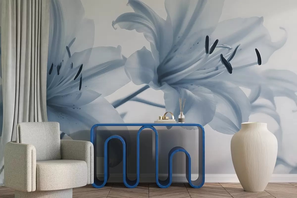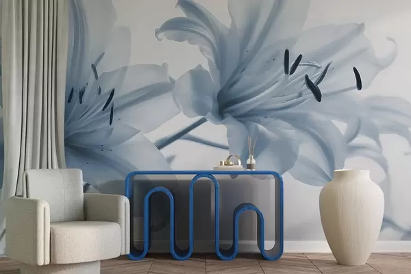 Valokuvatapetti Pehmeä tarkennus lähikuva sinisistä minimalistisista liljakukista vaaleaa taustaa vasten Nr w08586