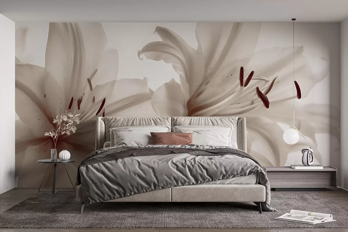 Valokuvatapetti Pehmeä tarkennus lähikuva beigeistä minimalistisista liljakukista vaaleaa taustaa vasten Nr w08586v1