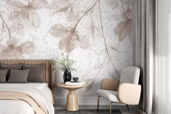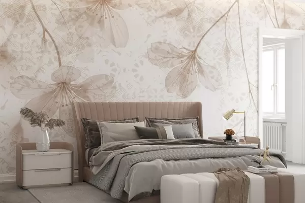 Valokuvatapetti Herkät beigen ja valkoiset kukat, joissa on pitkät varret ja terälehdet pehmeää, sumeaa taustaa vasten Nr w08588v1