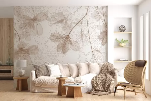 Valokuvatapetti Herkät beigen ja valkoiset kukat, joissa on pitkät varret ja terälehdet pehmeää, sumeaa taustaa vasten Nr w08588v1
