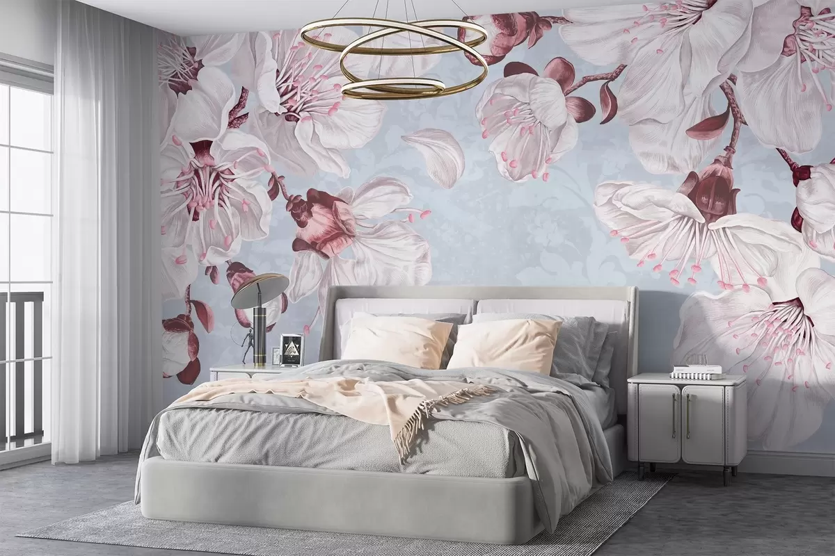 Valokuvatapetti Kukkapainatus, jossa on suuria vaaleanpunaisia ja valkoisia kirsikkakukkia vaaleansinisellä tekstuuritaustalla Nr w08601
