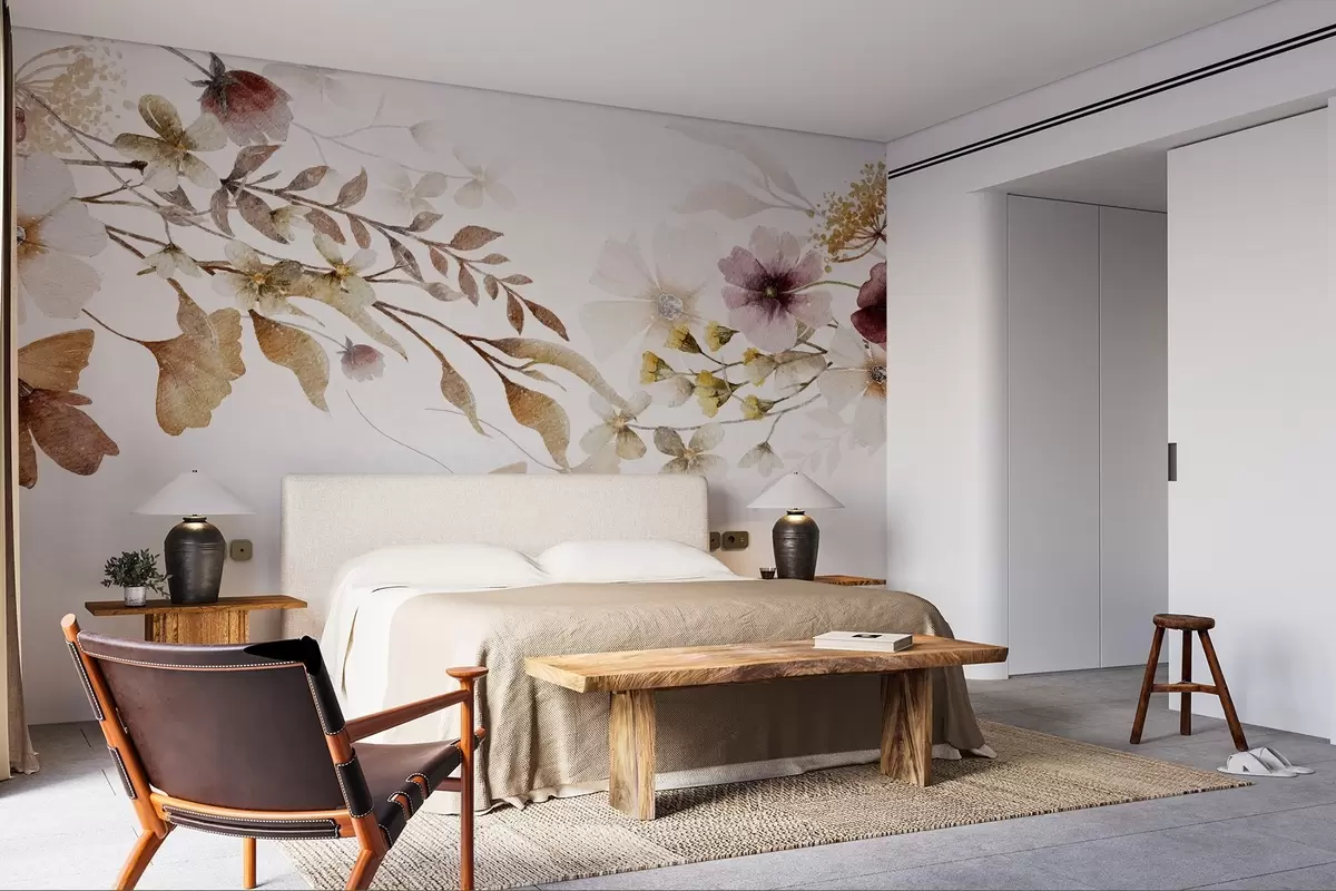 Valokuvatapetti Kukka-asetelma, jossa on pehmeät, hillityt värit, beigejä ja valkoisia kukkia ja lehtiä vaaleaa taustaa vasten Nr w08603