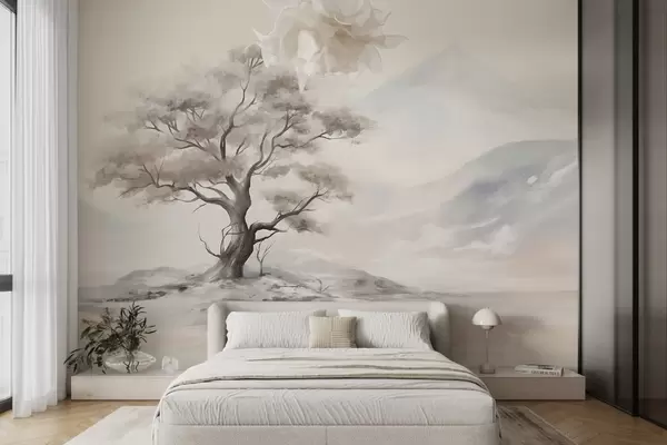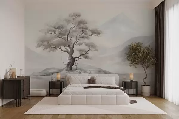 Valokuvatapetti Minimalistinen piirros yksinäisestä, kieroutuneesta puusta autiossa, kallioisessa maisemassa, jonka taustalla on vuoria Nr w08604