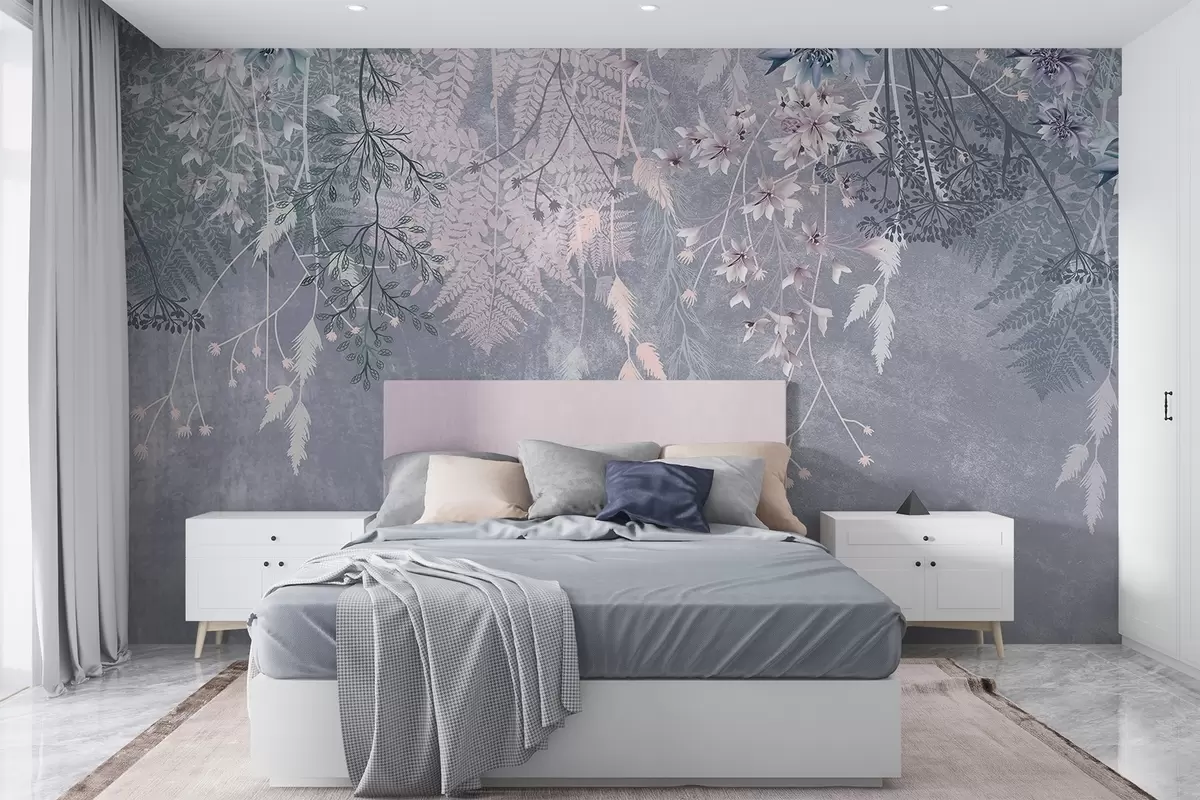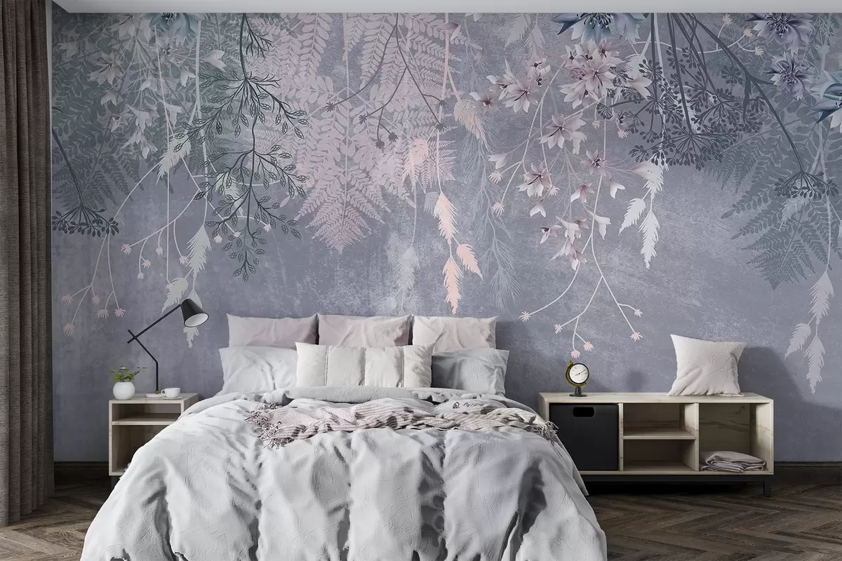 Valokuvatapetti Unenomainen, herkkä, hento kasveja, piikkejä ja kukkia sininen pastelli värejä vastaan sumuinen, kuvioitu tausta Nr w08606