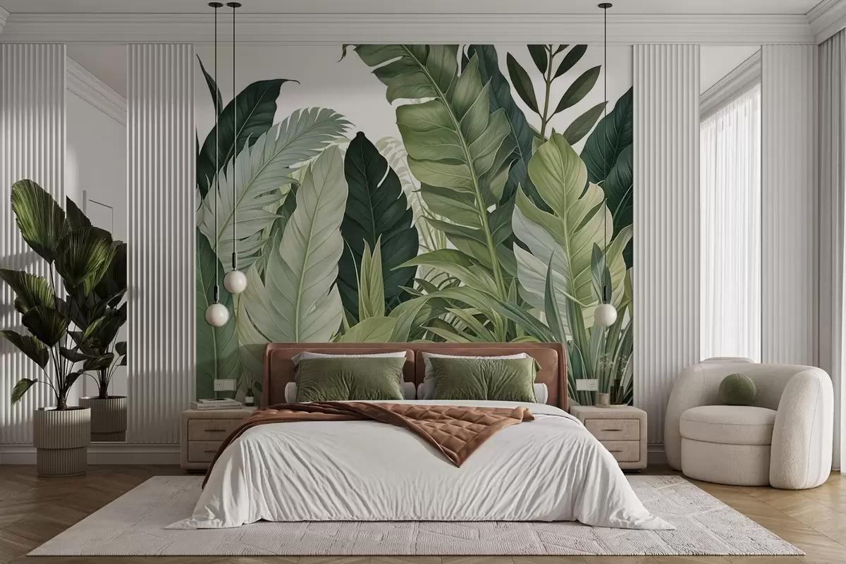 Valokuvatapetti Trooppiset lehdet, joissa on erilaisia suuria vihreitä lehtiä, kuten banaaninlehtiä, palmunlehtiä ja muita eksoottisia kasvilajeja Nr w08609