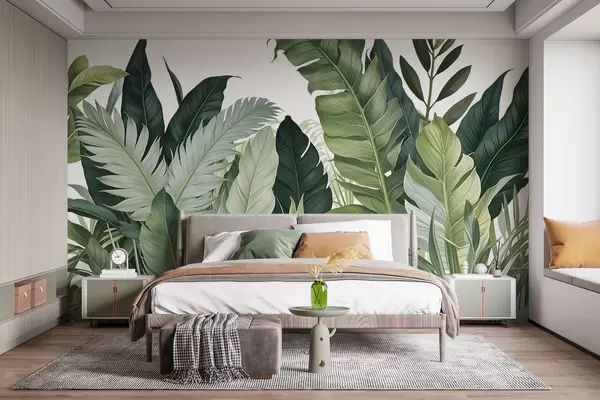 Valokuvatapetti Trooppiset lehdet, joissa on erilaisia suuria vihreitä lehtiä, kuten banaaninlehtiä, palmunlehtiä ja muita eksoottisia kasvilajeja Nr w08609