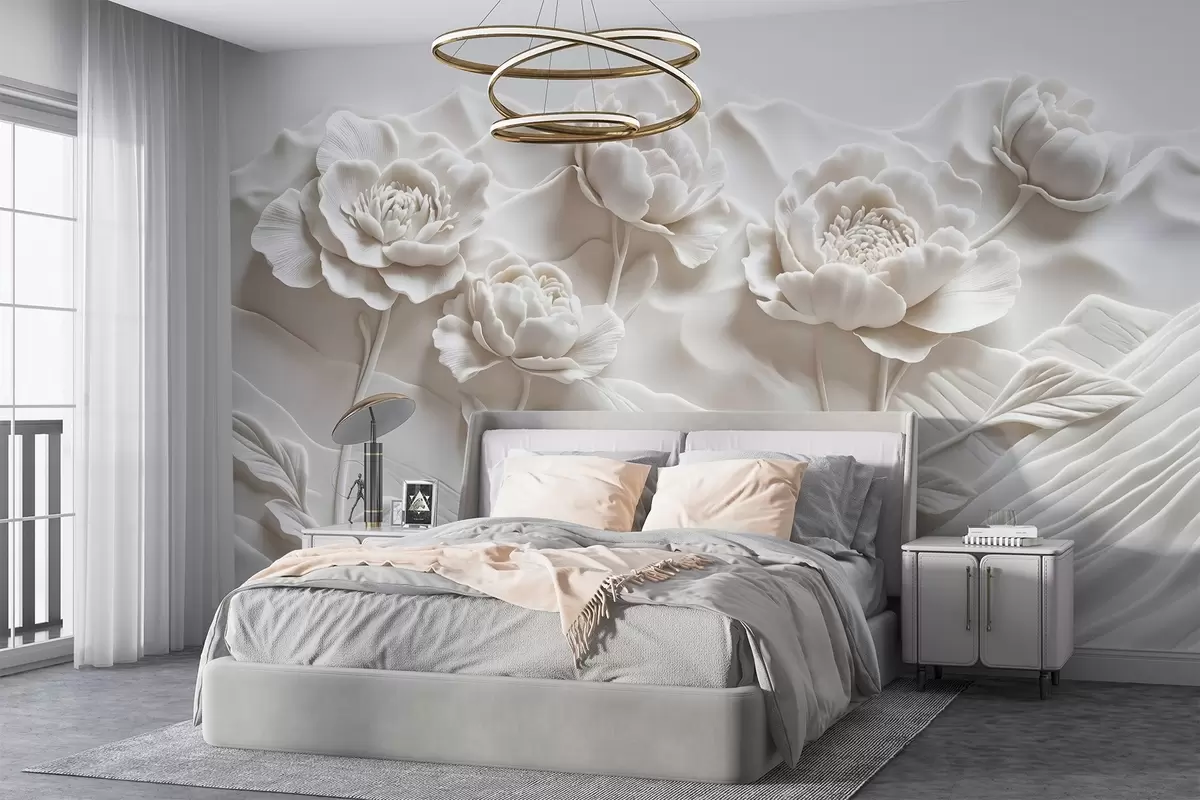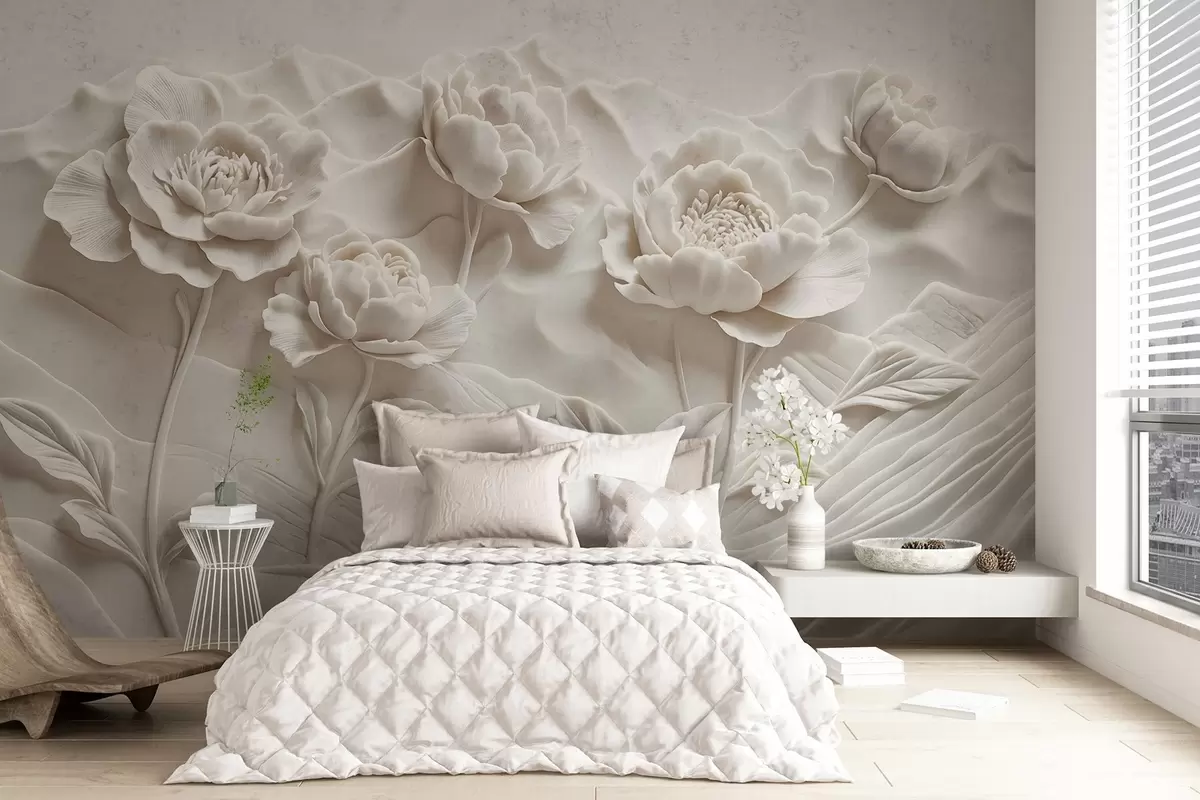 Valokuvatapetti Valkoinen kukkajäljitelmä, jossa on suuria, yksityiskohtaisia pionikukkia yksivärisellä pohjalla Nr w08612