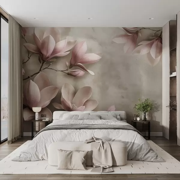 Valokuvatapetti Hento vaaleanpunainen magnolia betoniseinällä seepian sävyissä Nr w08636v2