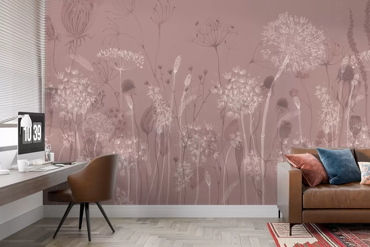 Valokuvatapetti Ilmava voikukkia ja luonnonkukkia vesivärityyliin vaaleanpunaisen sävyjä Nr w08637v1