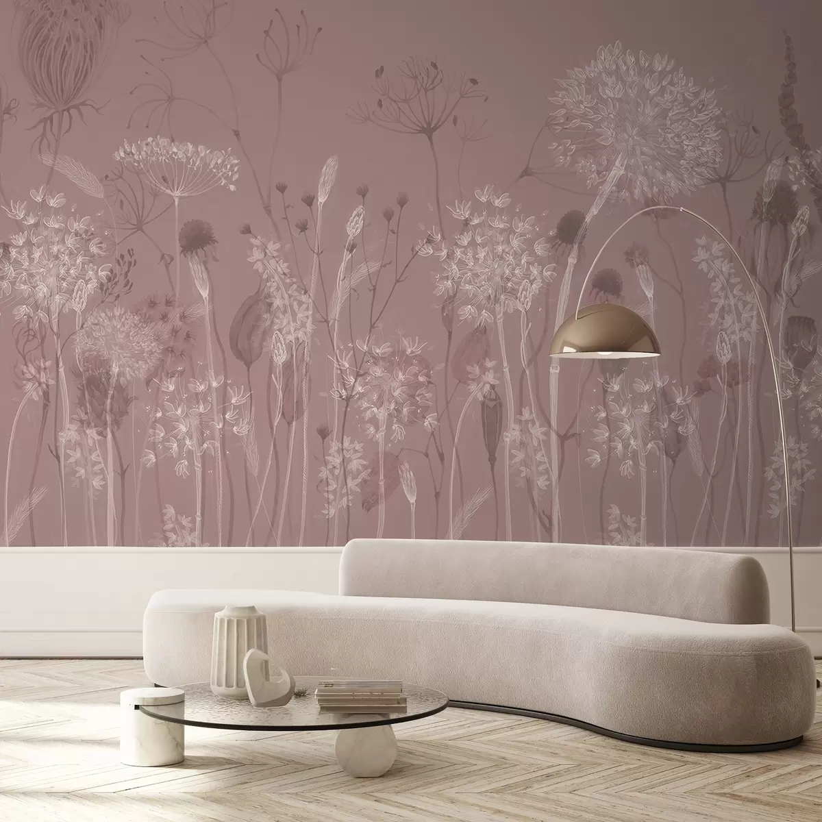 Valokuvatapetti Ilmava voikukkia ja luonnonkukkia vesivärityyliin vaaleanpunaisen sävyjä Nr w08637v1