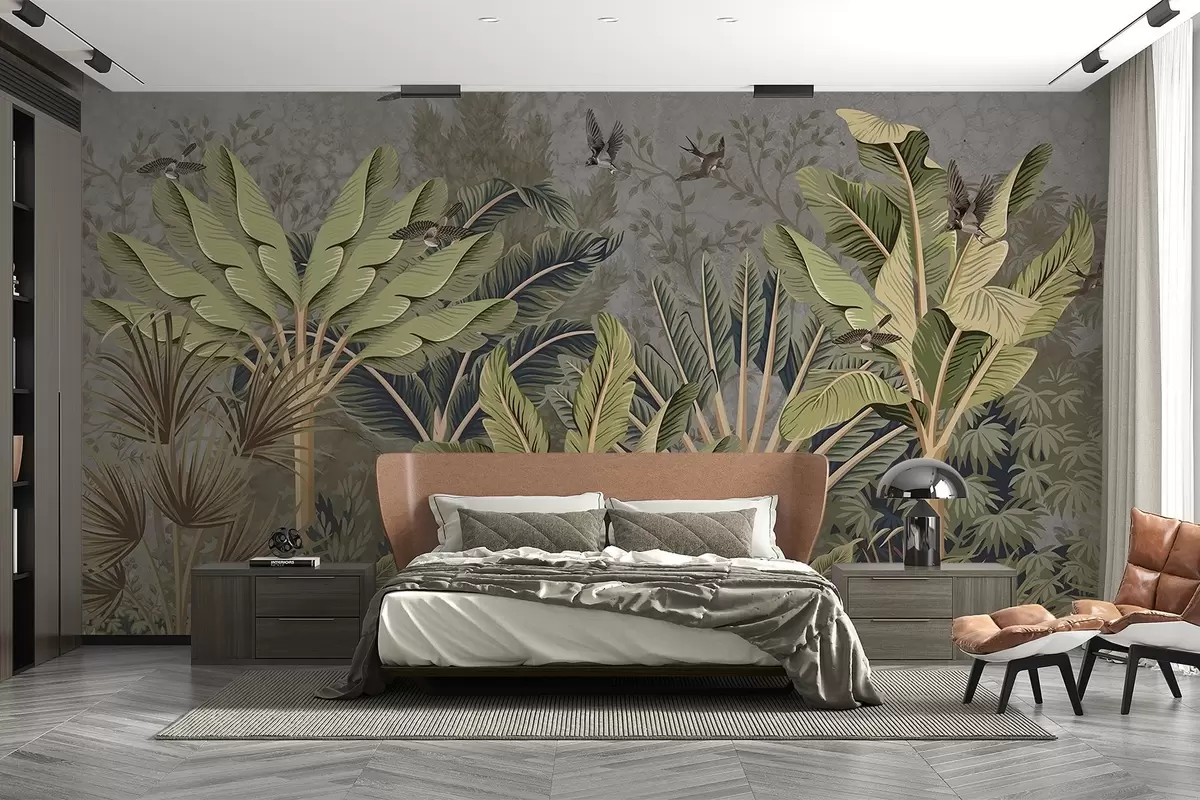 Valokuvatapetti Trooppinen viidakko, jossa on suuria lehtiä, palmunlehtiä ja värikkäitä lehtiä etualalla kuvioitua taustaa vasten Nr w08641