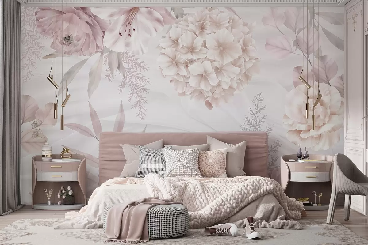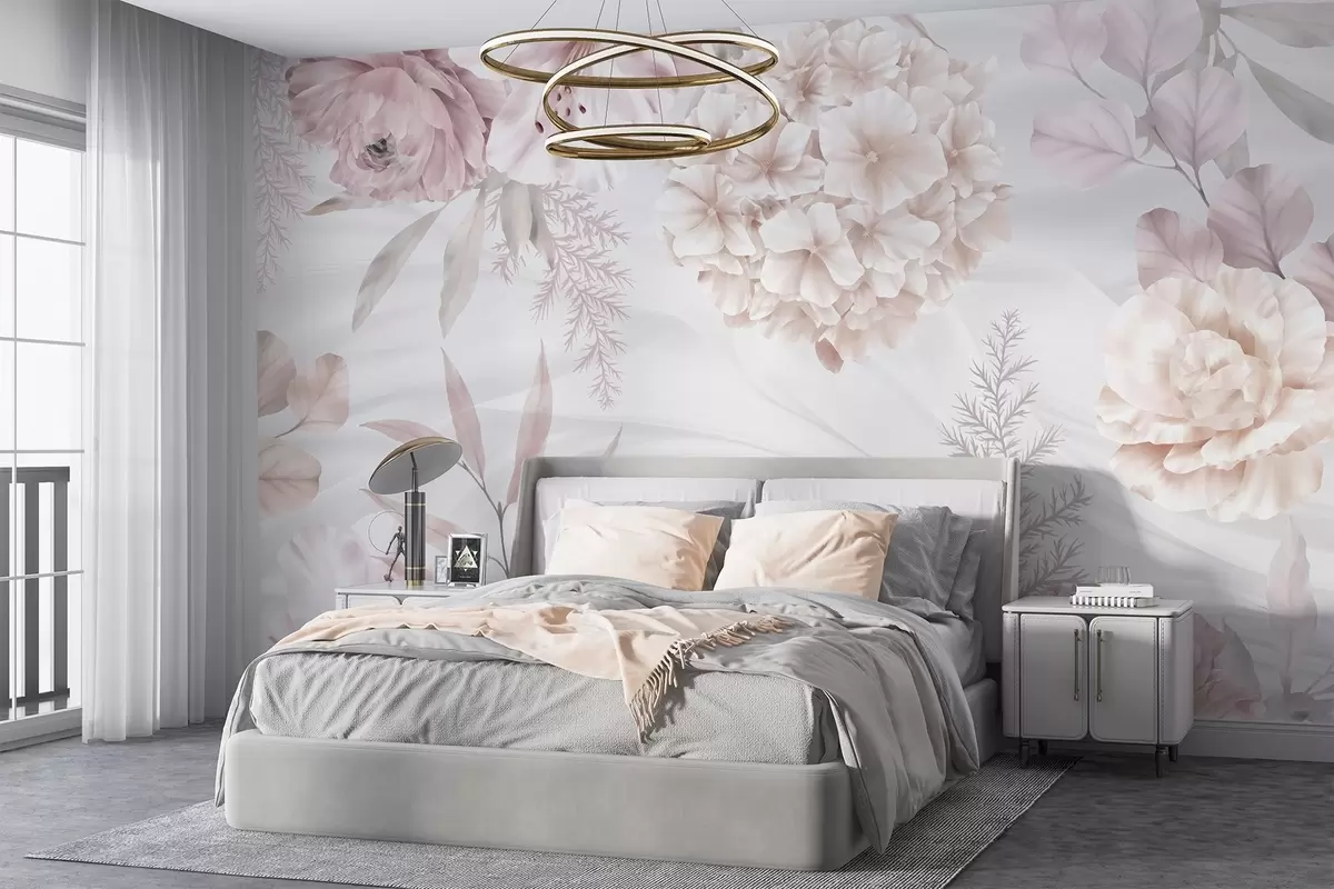 Valokuvatapetti Pehmeä, abstrakti kukkakuvio, jossa on suuria vaaleanpunaisia ja valkoisia kukkia, herkkiä lehtiä ja hillitty, pastellivärinen väripaletti Nr w08651