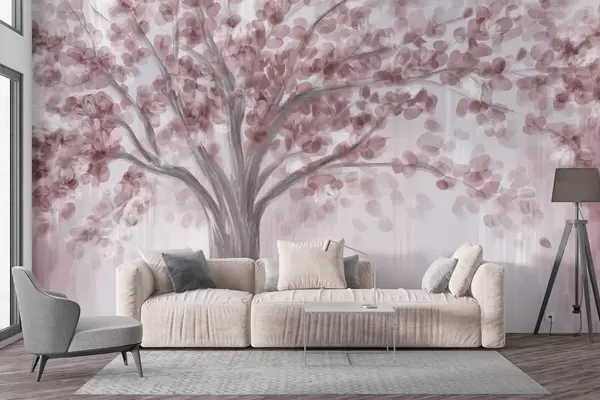 Valokuvatapetti Suuri puu, jossa on vaaleanpunaisia, abstrakteja lehtiä vaalealla, neutraalilla taustalla, joka korostaa puun sävyjä Nr w08669v2