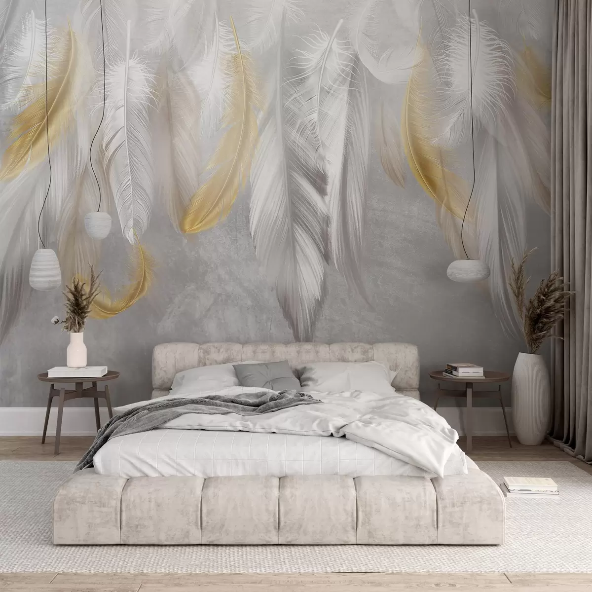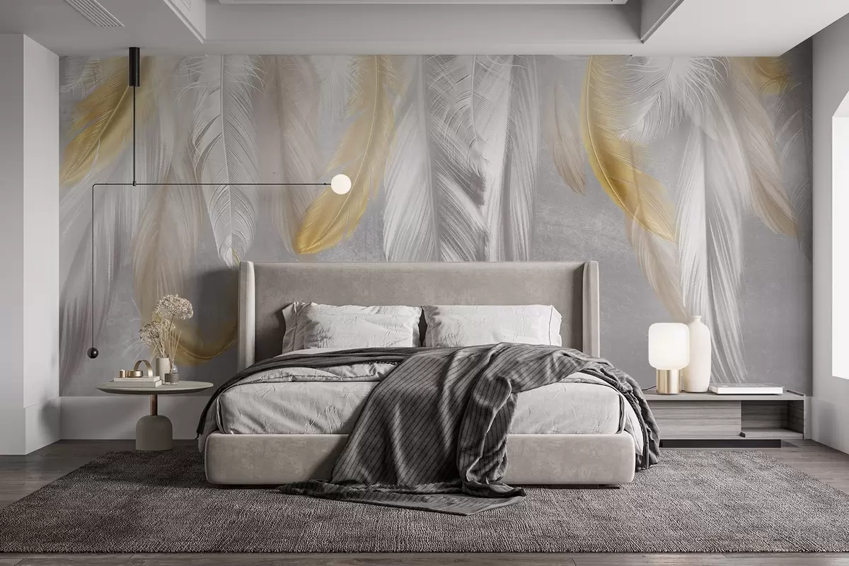 Valokuvatapetti Valkoiset ja keltaiset höyhenet roikkuvat pehmeää harmaata taustaa vasten, luoden herkän ja ilmavan sommitelman Nr w08670