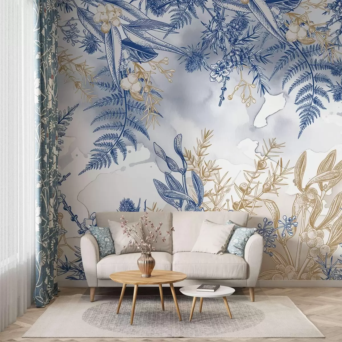 Valokuvatapetti Kukkapainatus, jossa on sinisiä ja keltaisia kasvitieteellisiä elementtejä vaaleaa, pehmeää taustaa vasten, jossa on vesiväriefektejä Nr w08671