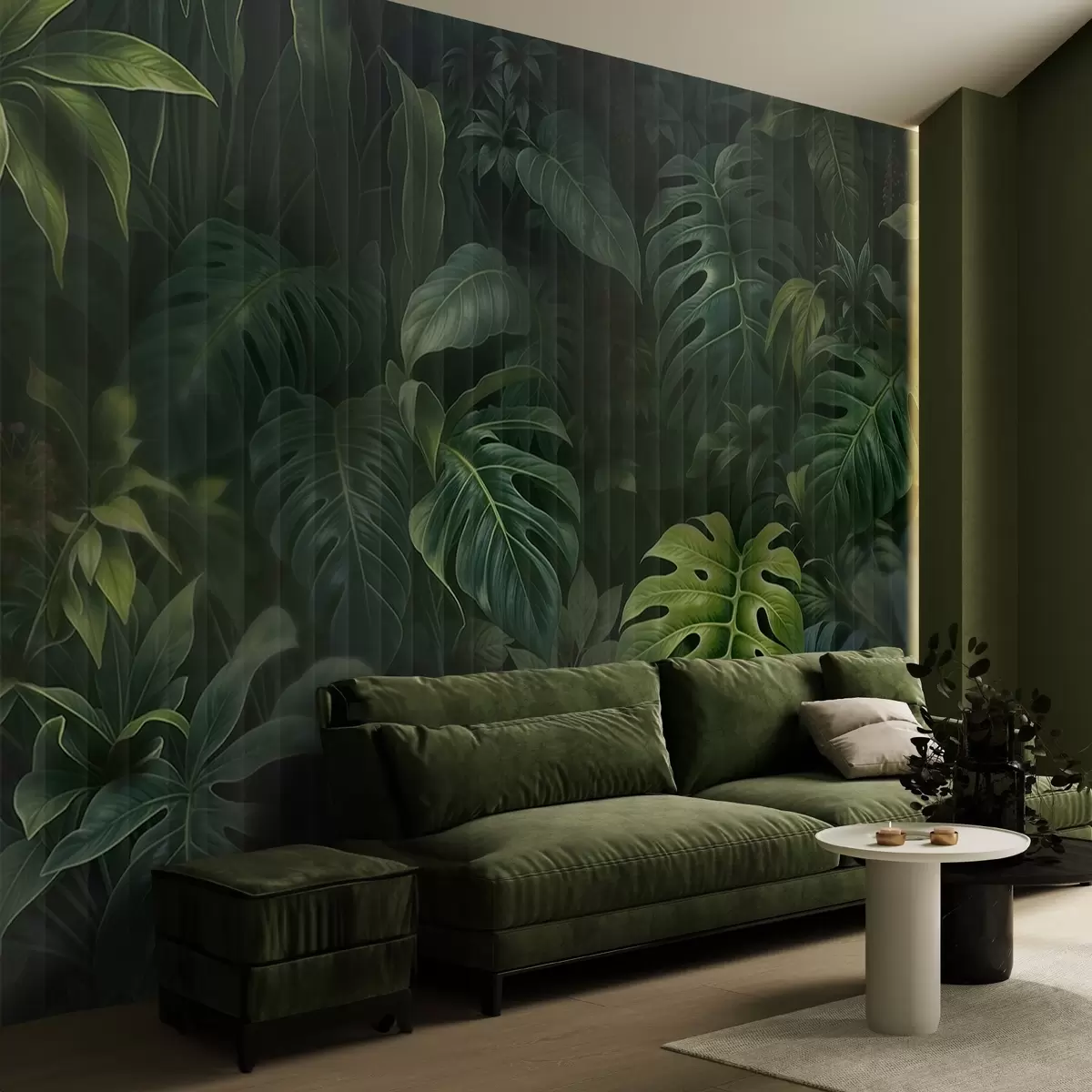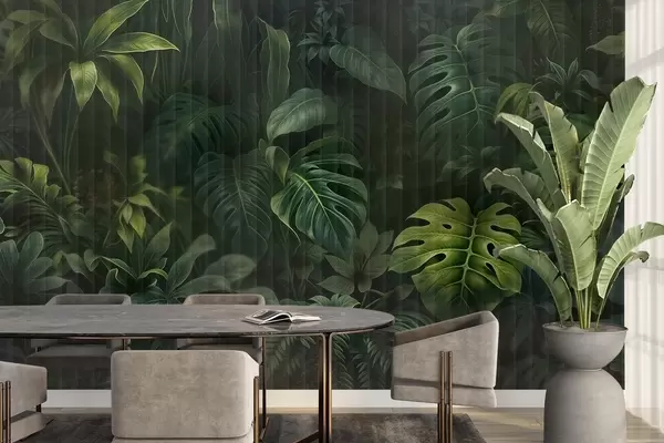 Valokuvatapetti Trooppinen tumma sumea ja kuvioitu painatus, jossa on erilaisia vihreitä lehtiä, kuten monsteran ja palmun lehtiä Nr w08673