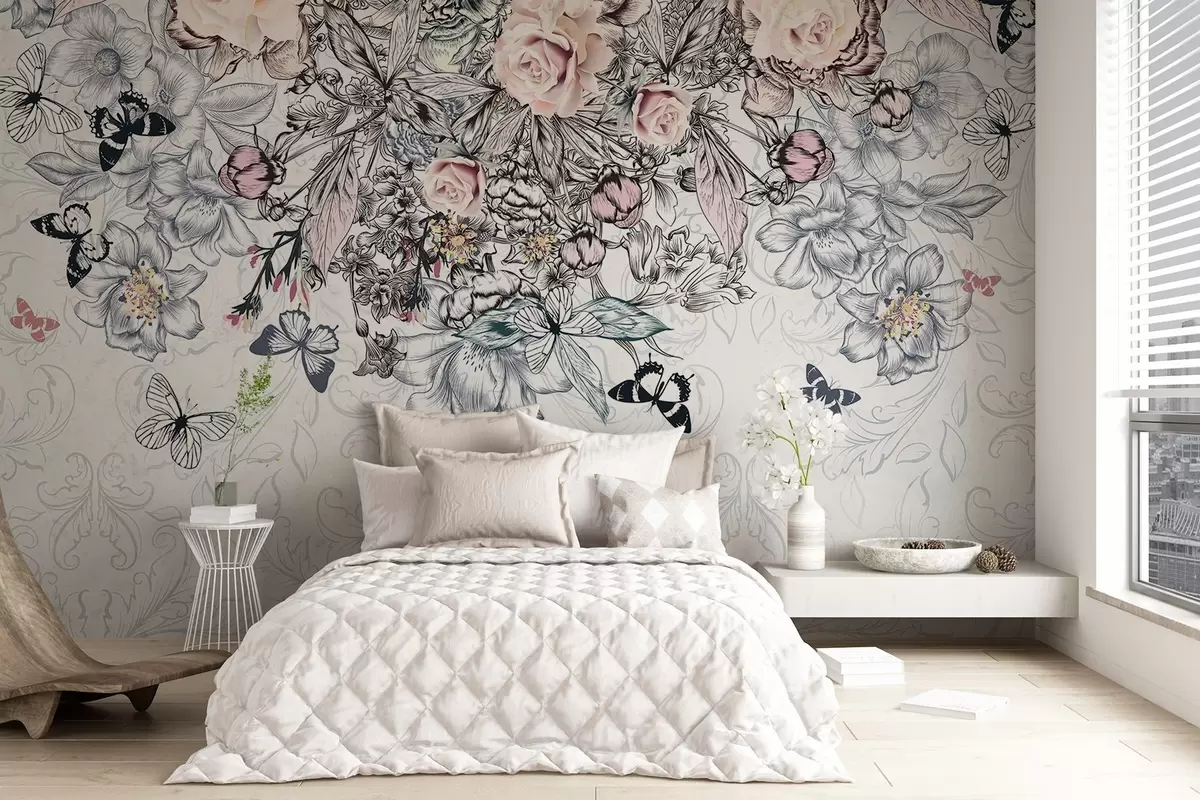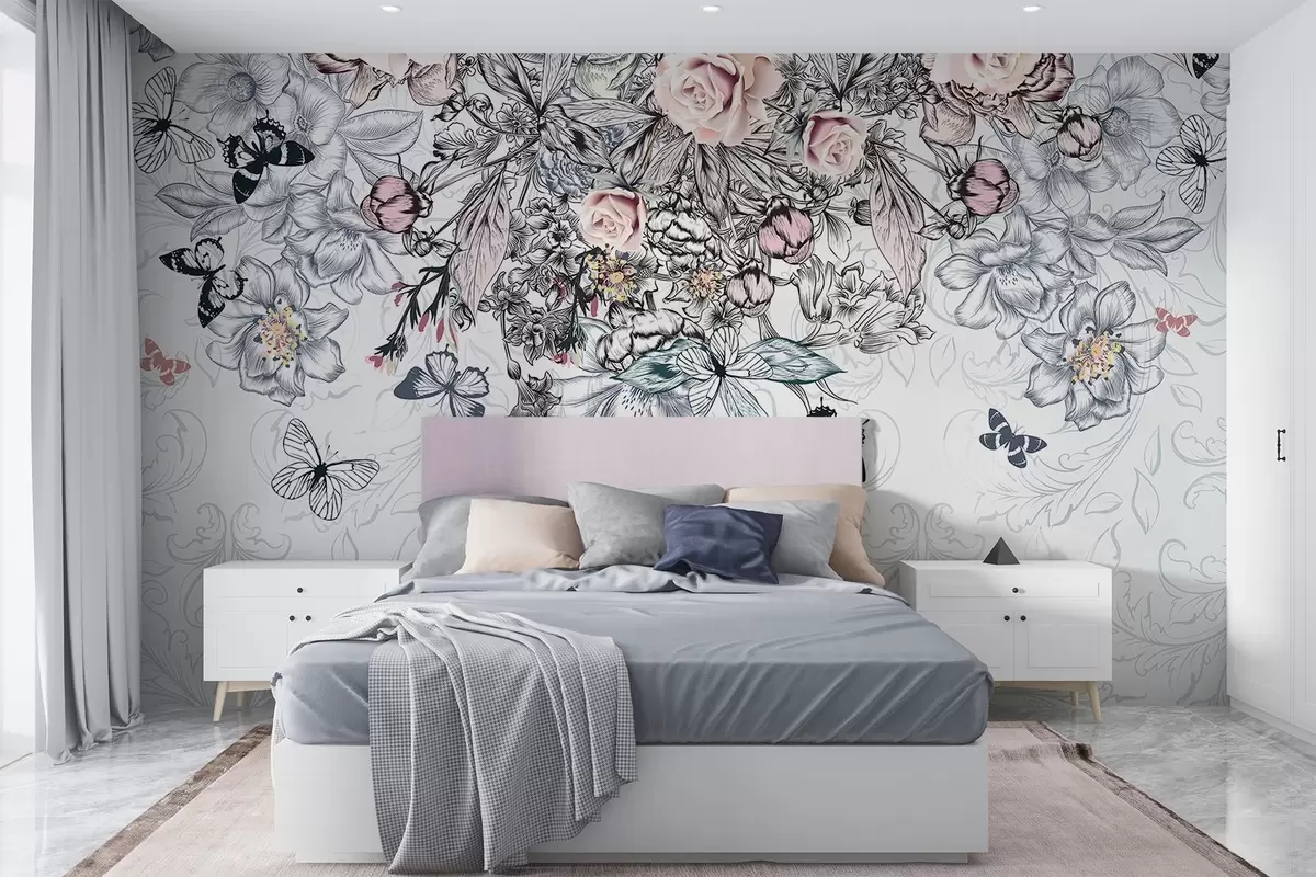 Valokuvatapetti Kukka piirustus vaaleanpunaisia ruusuja ja erilaisia kukkia ja perhosia monimutkainen viivataiteen kuvioitu tausta Nr w08674