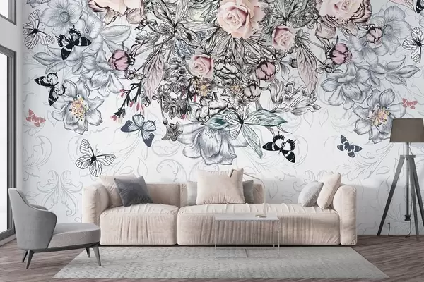 Valokuvatapetti Kukka piirustus vaaleanpunaisia ruusuja ja erilaisia kukkia ja perhosia monimutkainen viivataiteen kuvioitu tausta w08674