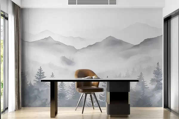 Valokuvatapetti Seesteinen vuoristomaisema, jossa on sumuisia metsiä pehmeän harmaan ja sinisen sävyissä Nr w08680