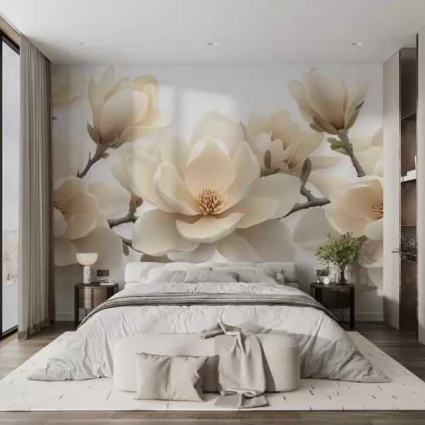 Valokuvatapetti Beige kukkivat magnolian kukat kermanvärisessä sävyssä valkoisella pohjalla Nr w08692