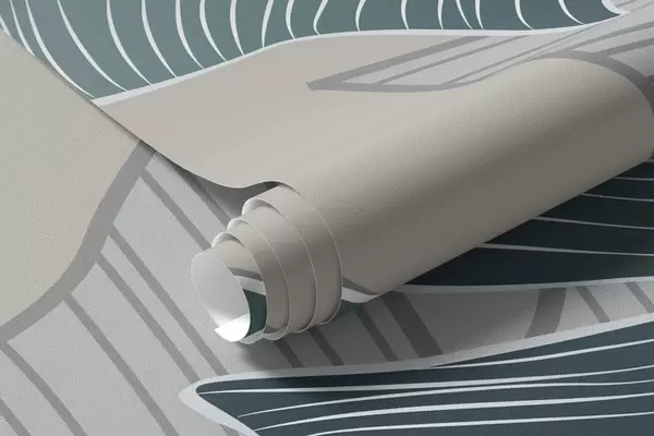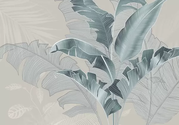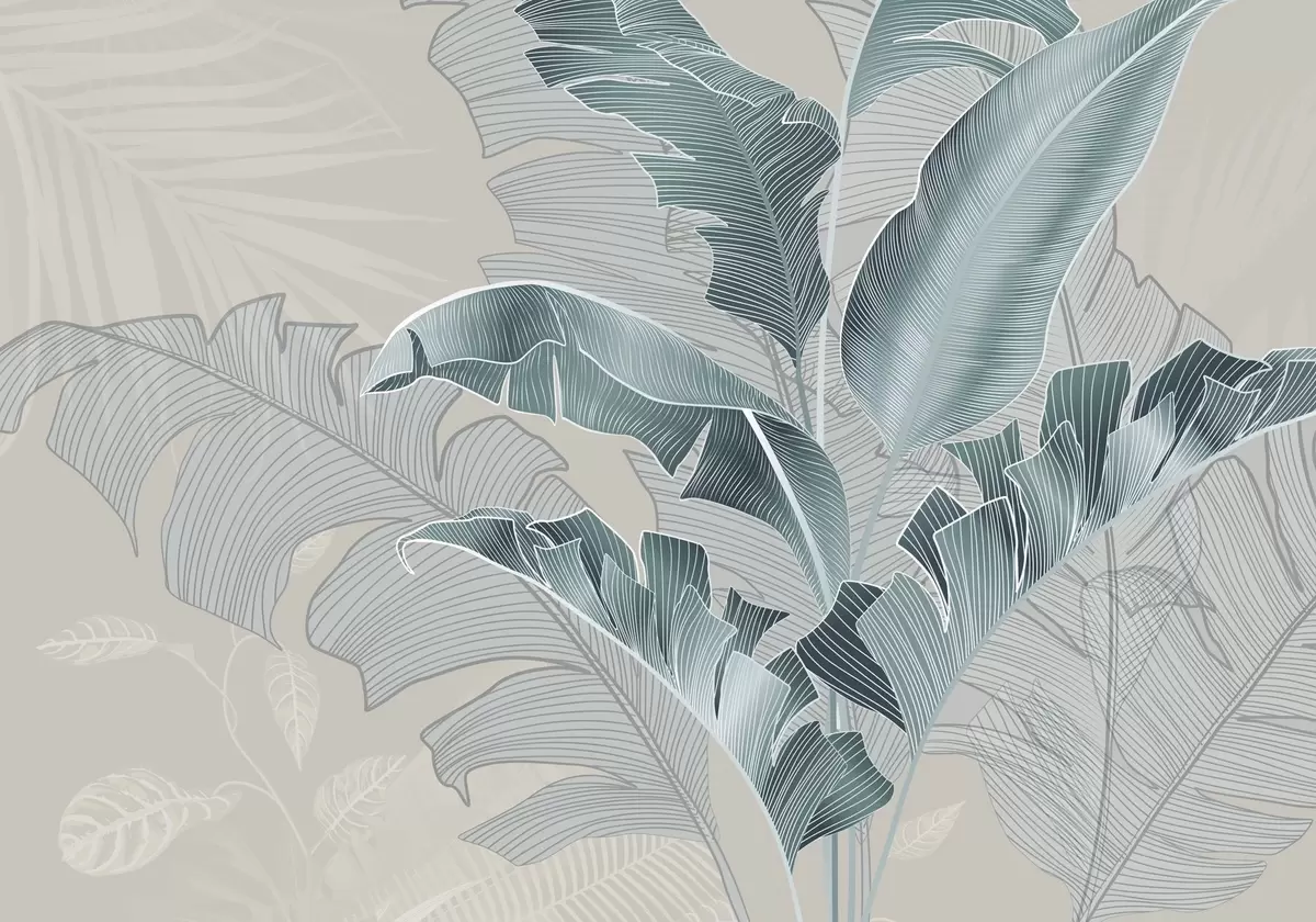 Valokuvatapetti Harmoninen sommitelma trooppisia lehtiä beigen ja turkoosin sävyissä, joissa on yksityiskohtaisia viivoja Nr w08698v1