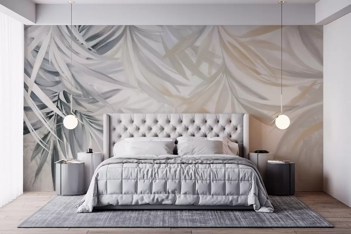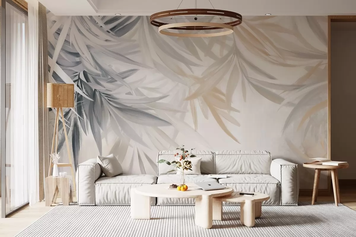 Valokuvatapetti Pehmeät, virtaavat vaaleat trooppiset lehdet harmaan ja persikan sävyissä, jotka sulautuvat vaaleaan, neutraaliin painatukseen Nr w08703