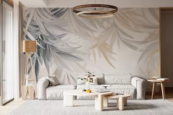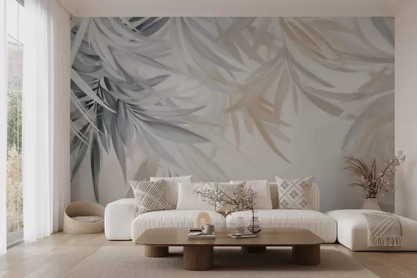 Valokuvatapetti Pehmeät, virtaavat vaaleat trooppiset lehdet harmaan ja persikan sävyissä, jotka sulautuvat vaaleaan, neutraaliin painatukseen Nr w08703