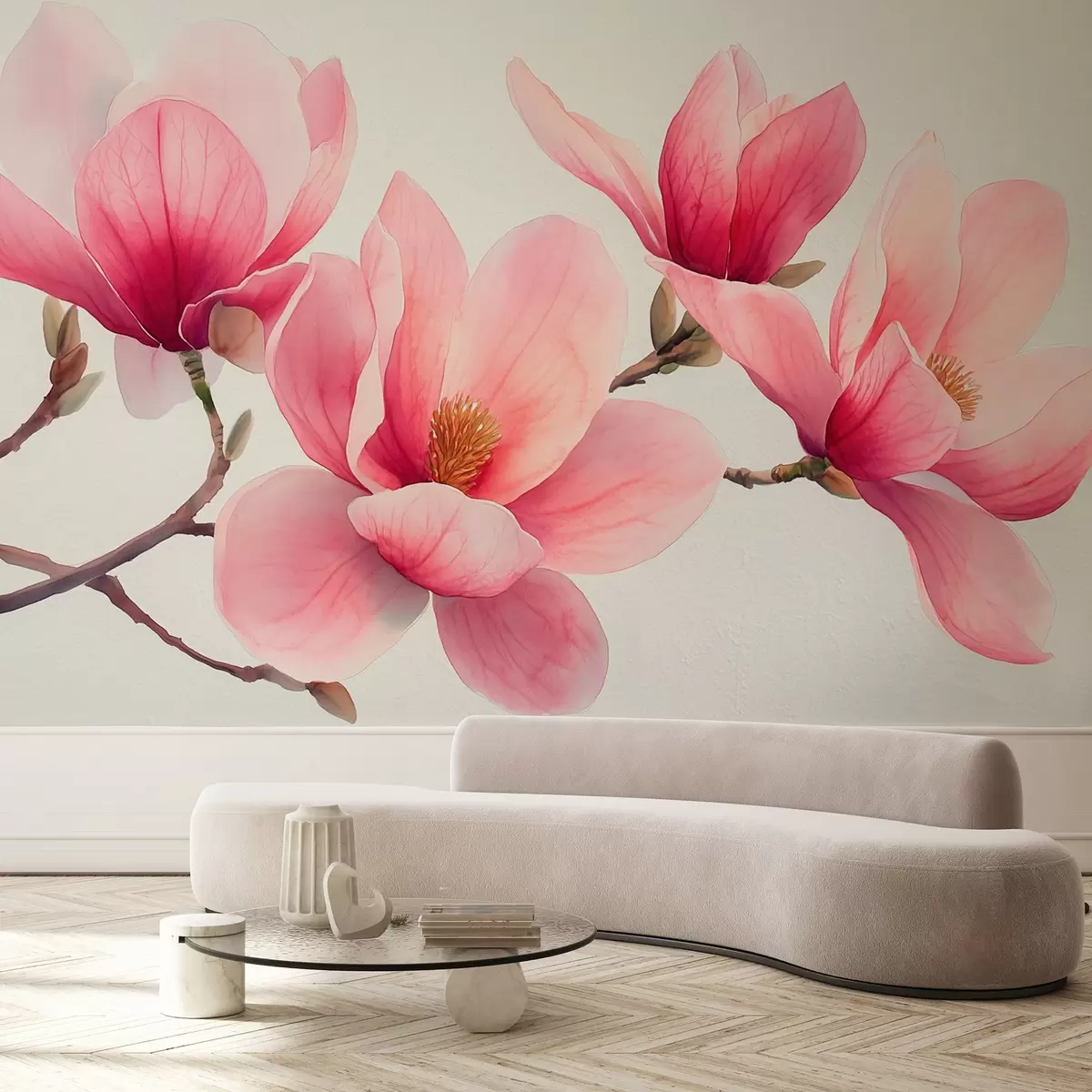 Valokuvatapetti Vaaleanpunaisia kevään magnolian kukkia akvarellityyliin vaaleanharmaalla pohjalla Nr w08709