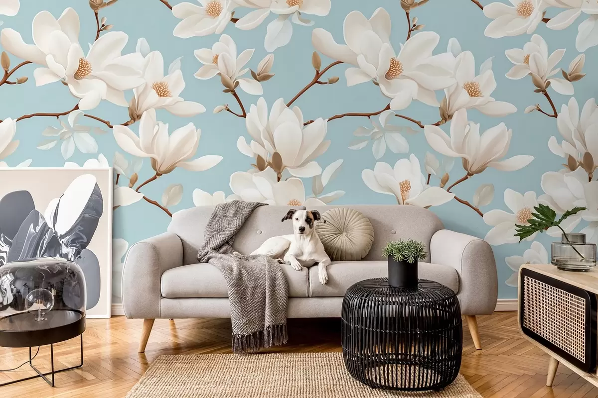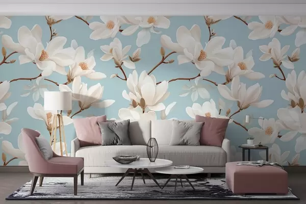 Valokuvatapetti Kuvio valkoisista magnolian kukista, pastellinsininen tausta, valkoiset lehdet ja oksat Nr w08726