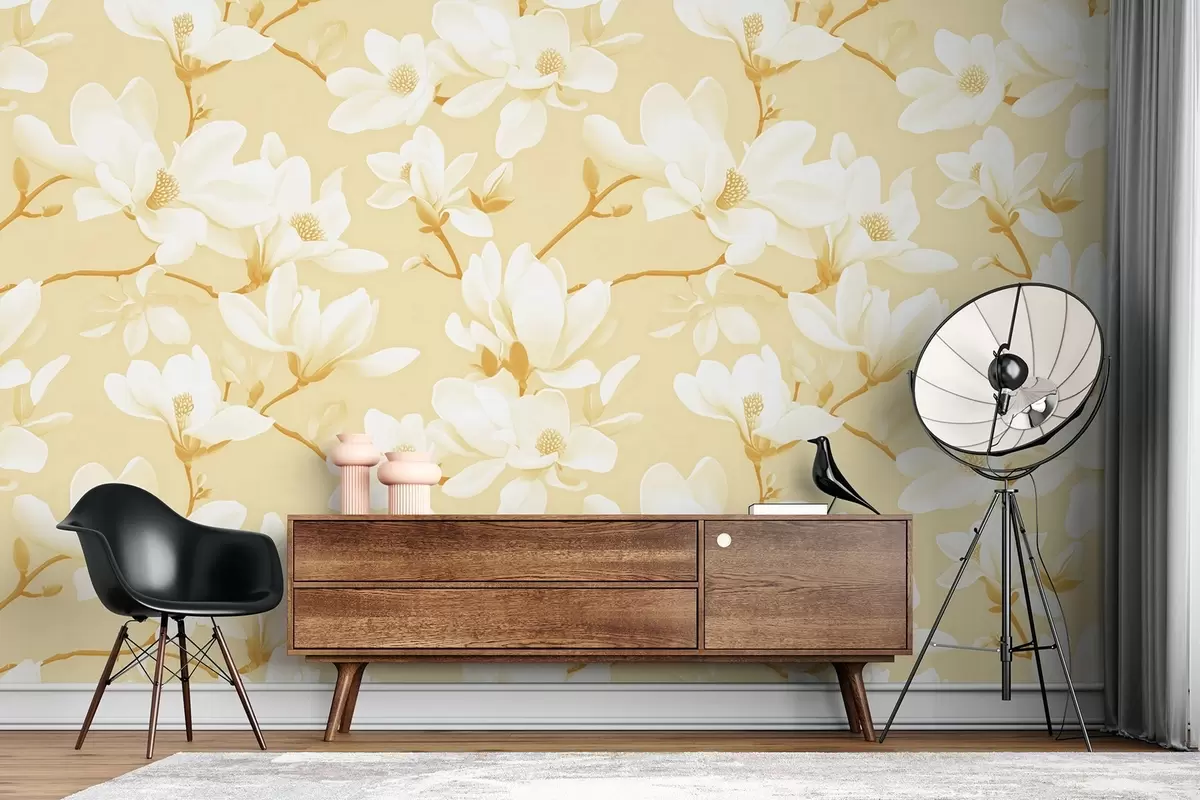 Valokuvatapetti Kuvio valkoisia magnolian kukkia, keltaisen sävyjä, valkoisia lehtiä ja oksia Nr w08726v3