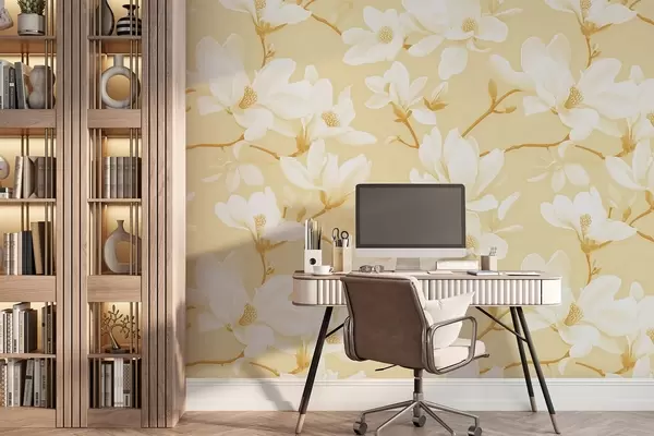 Valokuvatapetti Kuvio valkoisia magnolian kukkia, keltaisen sävyjä, valkoisia lehtiä ja oksia Nr w08726v3