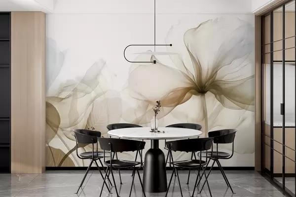 Valokuvatapetti Ruskeat abstraktit kukat, joissa on pehmeät, läpikuultavat, virtaavat terälehdet ja herkät yksityiskohdat valkoista taustaa vasten Nr w08742v1