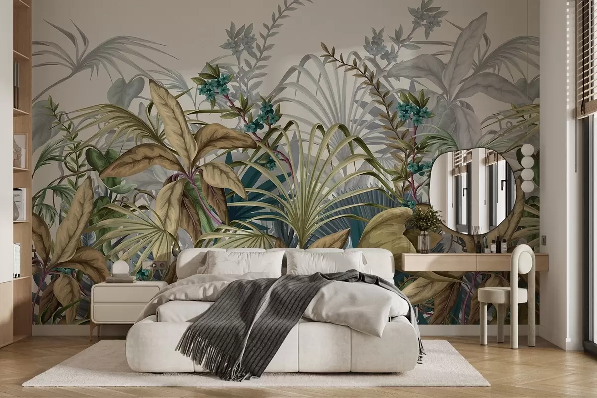 Valokuvatapetti Erilaisten trooppisten kasvien järjestely, joissa on suuret elinvoimaiset lehdet, luoden rehevän lehtikohtauksen vaalean beigen sävyisellä pohjalla Nr w08777v1