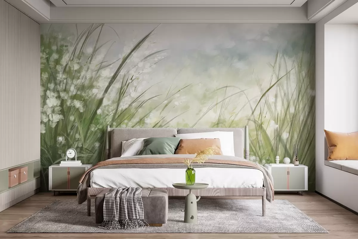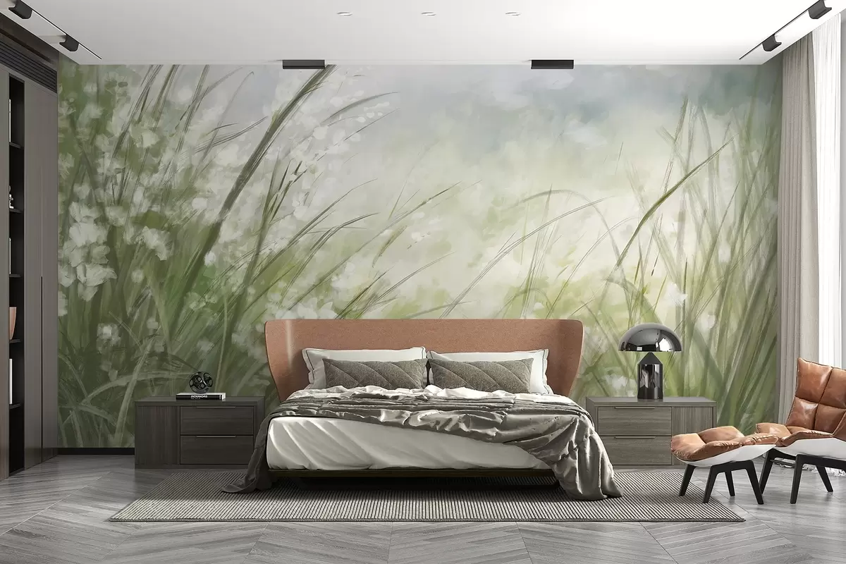 Valokuvatapetti Rehevä vihreä ruoho, jossa on herkkiä valkoisia kukkia, pehmeästi sumea tuloste vaaleilla sävyillä, luoden rauhallisen maiseman Nr w08779