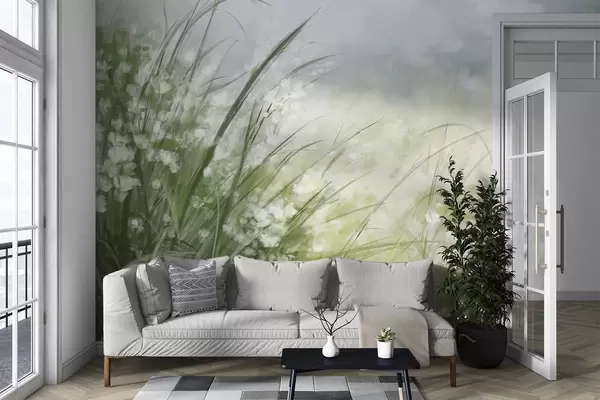 Valokuvatapetti Rehevä vihreä ruoho, jossa on herkkiä valkoisia kukkia, pehmeästi sumea tuloste vaaleilla sävyillä, luoden rauhallisen maiseman Nr w08779