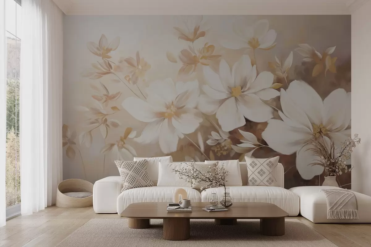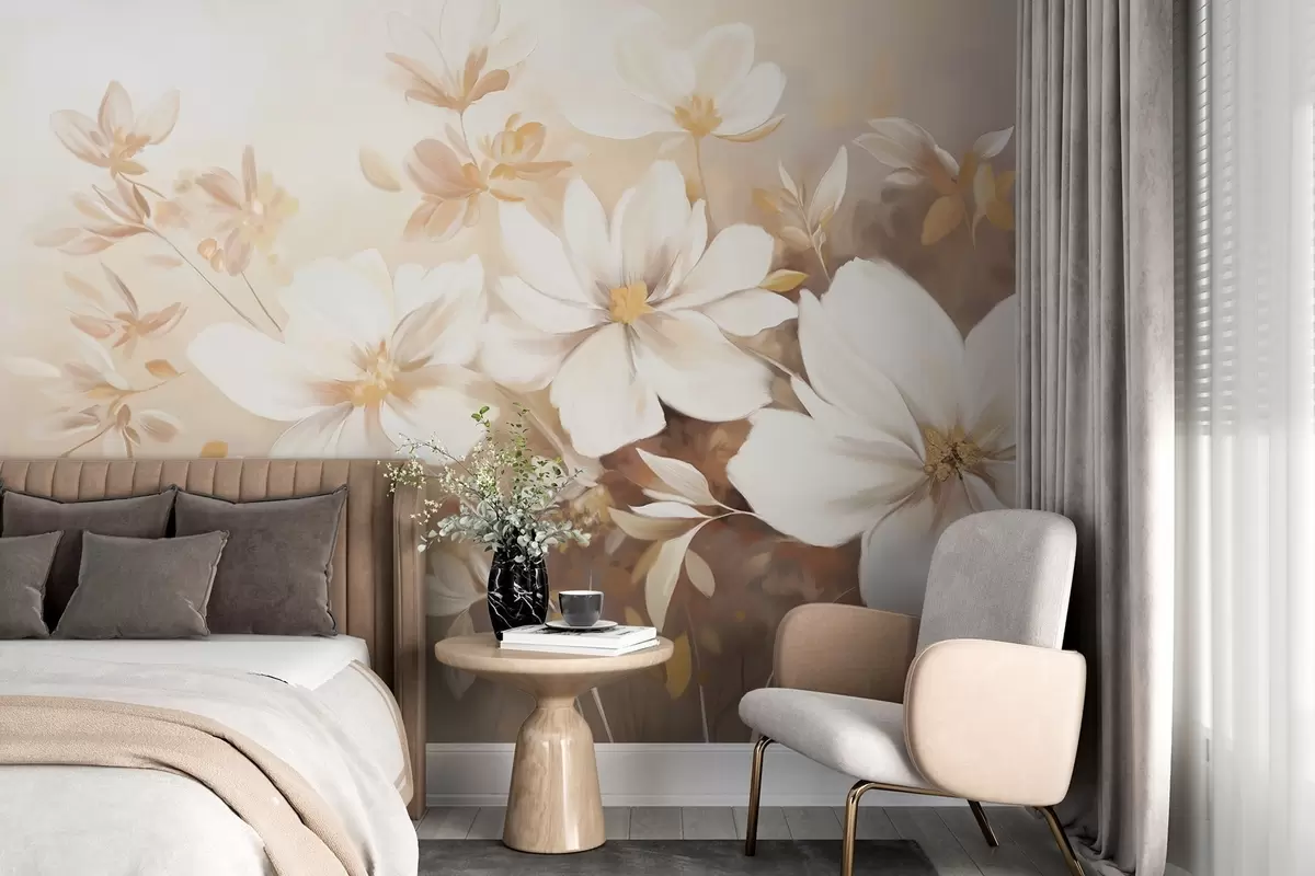 Valokuvatapetti Valkoisia maalattuja kukkia, joissa on pehmeät terälehdet ja herkät lehdet, vaalean beigen ja kermanväristä taustaa vasten Nr w08780
